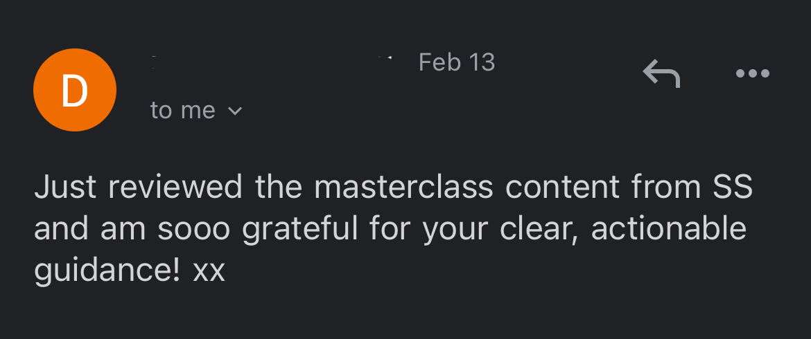 Along the way to creating $400,000 in sales and $345,000 cash received in just a few years in my business (as of March 2023), I've picked up a thing or two about business strategies that work that have nothing to do with whether your pussy chakra is blocked or not, and has everything to do with practical, simple, and effective methods to growing a profitable online business – and I want to teach as much of it as possible to you in this Masterclass series!